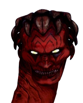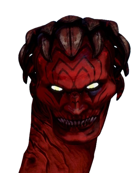 Bael takes the form of three separate snake-like entities with glowing eyes. A human head with red skin and stone-like dark brown hair and decorative black markings on. The second head is something like a feline head with brown fur. It also has small bone protrusions on its eyebrows and on the back of its neck. The third and final head is a design based on a toad head. It has green scales with almost wart-like lumps on with horns and spikes on its back, and noticeably larger eyes. The human head is considered as the leader or main head of Bael.