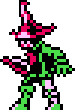Barbatos resembles a human male in physique with long, orange hair. Most facial features cannot be discerned due to his large hat, but what can be seen seems to be a large mouth with pointed teeth and gray-purple skin.