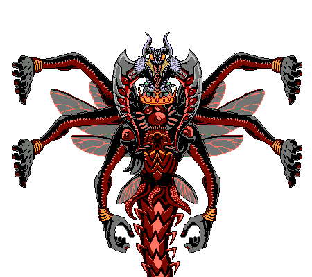 After landing, the boss itself will have taken a more grotesque form that can be seen in the background before it hops high into the air and grabs onto the walls to slow down its descent enough to face off against the player. In this form, the boss has six massive arms, with four of them being seen sliding across the walls. Its lower half is composed of multiple eyes and teeth with a crown on top of it. The upper half of the boss is the same as its first phase, only instead of having four horns on its head, it has two large ones, and its four arms are replaced with two scythe-like appendages with five eyes on each one. It also has a large tail that can briefly bee seen when the boss directly appears. Behind him are six large insect wings which he uses to fly.