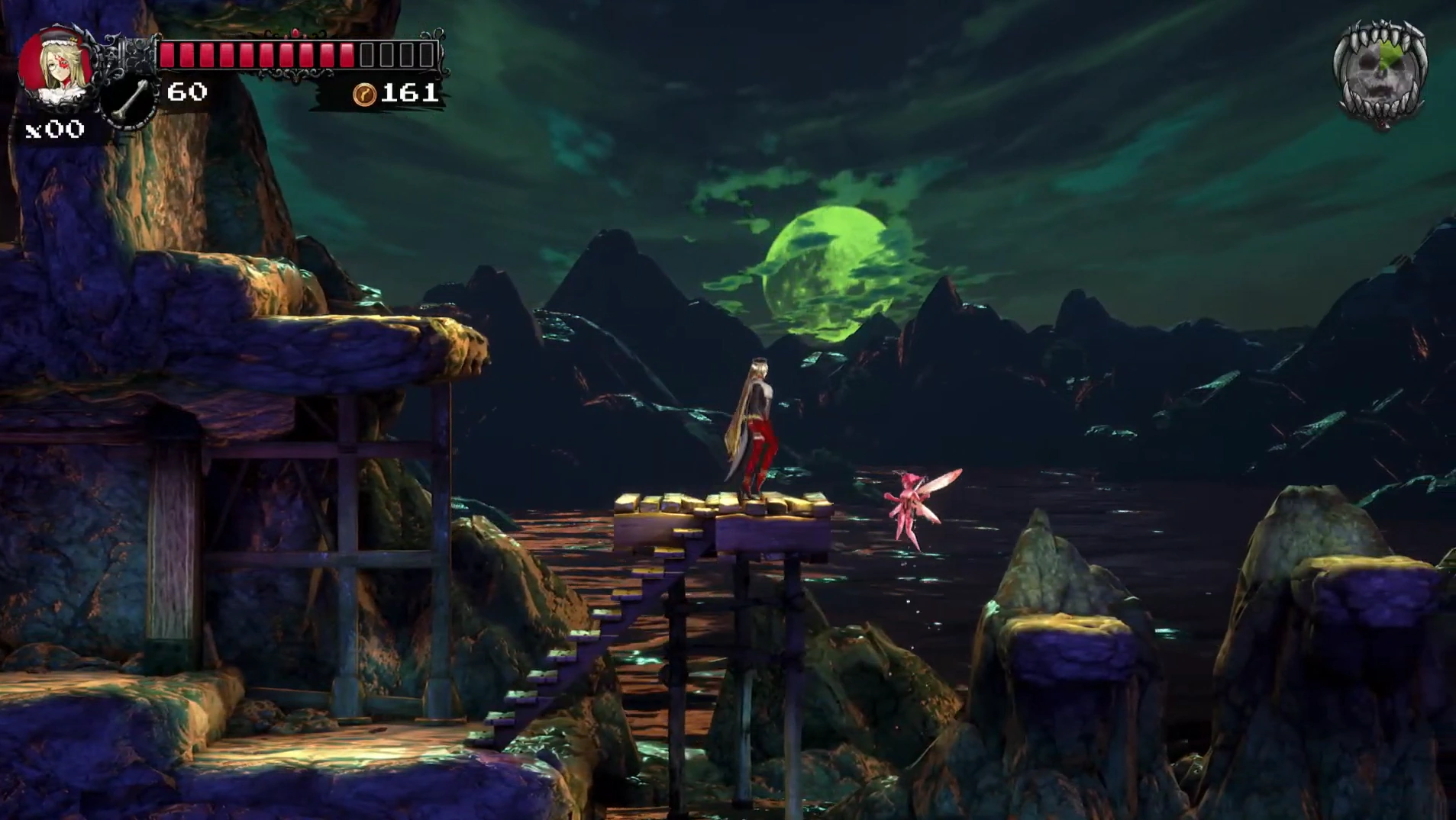 After reaching this area from the Stygian Marsh, Dominique will fight a few enemies as she approaches the cliff edge. Although it does not lead to an actual bottomless pit, jumping off the cliff will cause her to die, so she must instead descend it using stairs. After reaching the ground below, she can proceed left again, where she will find the entrance to Valefar's dungeon, the Clockwork Nightmare. She can also keep going right, where she will need to jump on platforms above an actual bottomless pit until she passes through a natural wall to reach the Malebolge Gateway, the foundation of the Pandemonium. A large lake can be seen in the background of the path to the latter area, but it has no bearing on gameplay.