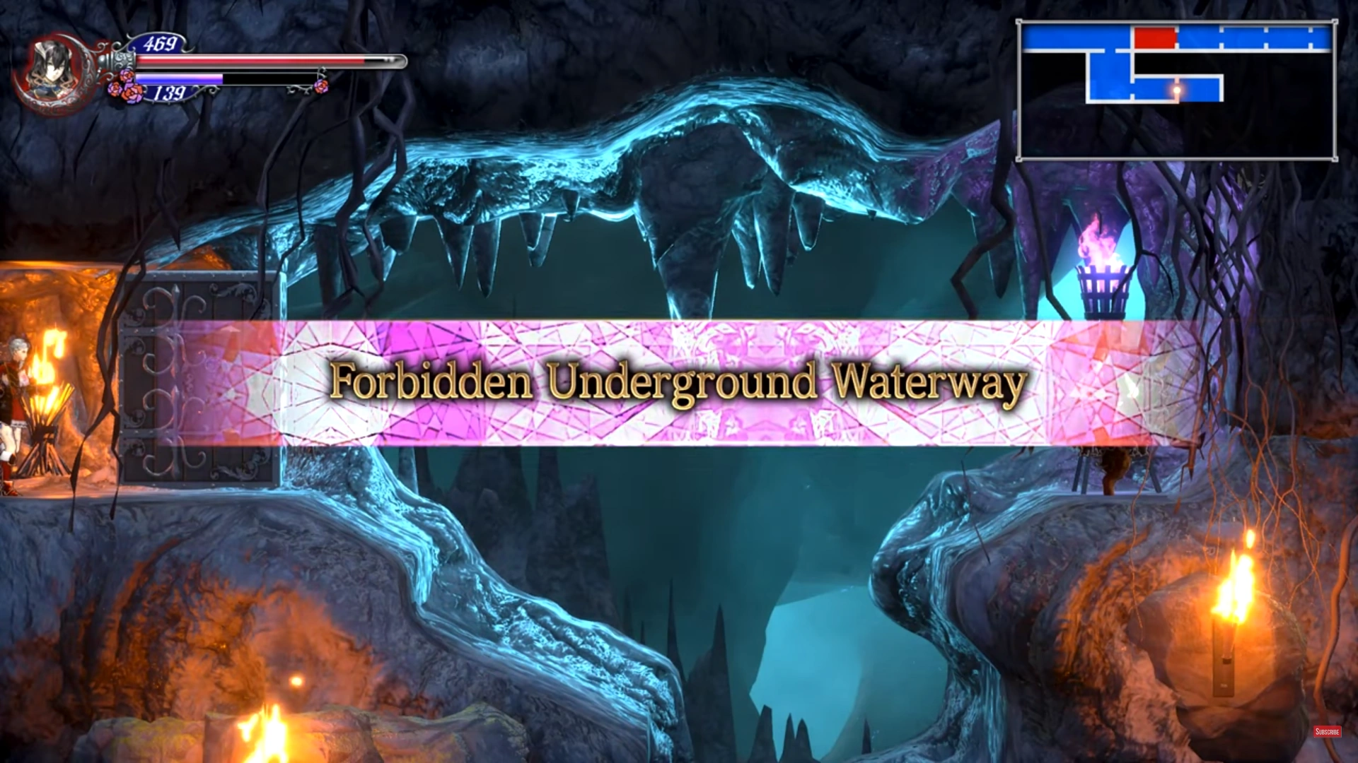 Bloodless initially cannot access most of this area but for a different reason than Miriam: she can swim but rapidly loses HP while in water. To properly explore it, she must first go to the Towers of Twin Dragons and defeat Valac to claim the Blood Steal ability. Using the Blood Steal, she must then drain the blood fountain in the Entrance to access dry parts of the Forbidden Underground Waterway.