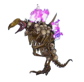 Orobas is the boss of the Inferno Cave. While referred to as a "half-man, half-stallion" creature in his description, he looks more like an odd bipedal creature constructed of all manner of animal bones. Along his back are several human skulls clumped together, with four ribs protruding out which have a lingering purple flame on the tips. In the midst of these is the charred upper body of a man, glowing with the same hellfire and the face stuck in a gape. The core of Orobas is a set of shark jaws that fills up the center. His legs, made out of typical avian bones, are digitigrade. His tail seems to be made of vertebrae. The golden head is a horse skull without the lower jaw, and with two downswept horns on the sides.